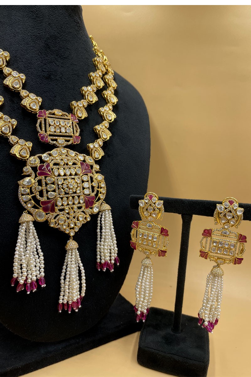 Silver Moissanite Polki Birds Dangle Earring & Necklace Set, Moissanite Polki Bridal Necklace, Indian Traditional Jewelry, Wedding Bridal Necklace And Earrings Set, Natural Pink Beads And Peals Necklace Set